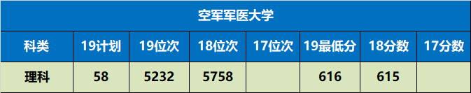 报考:空军军医大学就是原第四军医大学,2018年正在陕西第一次招收非军籍学生。非军籍就是和处所院校享受同样的待遇,需要交膏火和住宿费,结业需要本人找工做。2018年登科的最低分数为615分,位次为5758,2019年登科位次有所上升。登科分数最低的两个专业是护理学和生物手艺,若是能接管这两个专业,位次正在5500摆布就能够冲这个学校。临床医学类专业的登科分数正在5000位次以内。该校和交大医学院的登科分数比力接近,从两所学校的专业实力来说,四医大稍占劣势,两所大学具体该怎样选择,仍是看本人的爱好吧。
