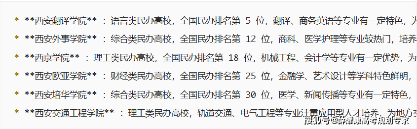 西安工程大学、延安大学、陕西理工大学、西安医学院、西安航空学院、西安美术学院、西安体育学院。这几所院校都是通俗本科院校,建校汗青长久、学风浓重,有浩繁的学位授权点和国度特色专业及省级沉点学科,正在此深制,你的将来不是梦。