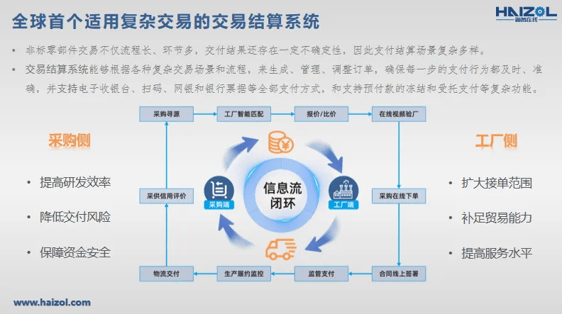 市场也因而存正在如许的现象:采购商需按照零件的材质、工艺及精度等要求,建立多源供应收集。而工场亦需维系多个客户关系以均衡产能。构成复杂的多对多买卖布局。这种网状协做布局雷同于熟人经济——采购商需深谙行业人脉才能找到婚配供应商。此前的“熟人经济”往往因消息不合错误称和信用不传送的问题,导致效率低下。而现在海智平台通过数字化手艺沉构这一市场,将全球供需消息汇聚于同一平台,使采购商能冲破地区和人脉,实现需求取产能的智能婚配,将保守盲找升级为所见即所得的精准对接。平台买卖数据全球制制工业采购邦畿正派历深刻沉构:一方面,保守商业目标地和欧洲地域订单虽然规模仍陪伴平台全体扩张连结增加,但占比呈现布局性下降;另一方面,新兴市场兴起势头迅猛,以一带一国度为例,其订单量自2020年起实现30%-40%的初次迸发性增加,至2023年更告竣197%的同比增幅,即便正在客岁仍连结50%以上的增速。正在如许的款式演变下,不只带来增量机缘,更鞭策平台生态向更多元化成长——大量来自目生国家的采购商涌入,使市场呈现史无前例的复杂性。面临全球化市场日益复杂的商业,中国中小微工场面对诸多压力。海智正在线平台通过建立全链条办事系统,帮力中国中小微工场实现能力升级。好比正在采购侧,我们察看到出海企业面对显著的供应链系统不顺应——国内制制业持久构成的赊购文化,30-60天,以至180-240天的账期都很常见,而海外市场遍及要求有预付款,以至部门地域要求100%预付。这种杠杆率上的反差,也就使得国内供应链对高效金融东西有很强依赖,而我们今天所会商的供应链金融行业也就有了其成长的优良根本。此外,正在工场侧也存正在一些中国特有现象:中国中小微工场持久依靠于财产链焦点企业,会遍及构成“单一行业,以至单一客户的供应商”的身份认知。这种依靠性使工场面对着庞大风险——当焦点企业或所外行业危机时,供应链连带效应就会导致整个链条上所有的供应商城市呈现订单萎缩取现金流断裂风险。因而,海智平台通过“用底层工艺定义工场”的立异,将工场能力拆解为底层工艺模块,建立跨行业工艺图谱数据库。这种沉构使工场冲破保守行业鸿沟,具备衔接多元订单的能力,从而降低运营风险,加强其能力。针对B2B非标零部件买卖的复杂性,海智正在线和多家银行和领取机构,合做搭建了全球首个合用于非标零部件B2B买卖市场复杂买卖场景的买卖结算系统,雷同于建立了工业级领取中台,该中台雷同于消费端领取中台东西但又存正在素质差别。和保守消费端的仅有的退货退款、仅退款的简单逆向流程分歧,非标零部件范畴的领取会存正在退款、部门退款等良多复杂的逆向流程。所以需要庄重而完整地将买卖地全貌还原到线上。因而这个买卖结算系统需要具备支撑各类极端买卖场景时的资金流办理能力。目前我们正正在搭建一套合用于非标零部件B2B买卖市场的金融系统,该系统不只支撑根本领取功能,更能处置退款、扣款、价钱沉议等八十余种买卖场景,构成闭环式资金管控,实现了预付款的定向利用监管。正在有预付款的买卖中,帮帮采购商管控其领取的资金的实正在用处是为其订单采办原材料、耗材以及物流等办事,确保其资金能够专款公用,进而降低交付违约的风险,也能够帮帮金融办事机构实现其资金利用的管控,正在买卖竣事后能够从动完成还本付息等供应链金融的清理流程。这种立异不只保障了买卖资金的平安,更鞭策了B2B买卖效率的量变。
