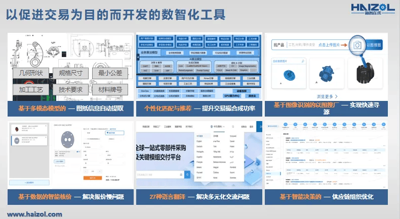 除了上述的根本能力之外,海智正在线还建立了一系列数字化东西,好比我们的图纸智能解析功能,通过利用AI手艺实现图纸的从动解析,实现图纸的工艺特征提取取智能婚配,个性化的供需婚配取精准保举机制。通过以图搜图功能,我们帮帮采购商快速定位适合的供应商,同时平台具备27个语种的智能翻译能力,消弭了全球供应链的言语壁垒。这些东西链的协同感化,使中国工场正在全球化合作中兼具效率取成本劣势。