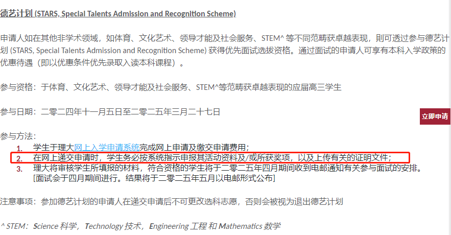 再好比港理的德艺打算提出,申请人正在体育、文化艺术、STEM、社会办事或带领才能等范围中获得杰出成就,可正在网上递交申请时,供给其勾当材料/所获项,以及相关的证件,即可获得优先面试选拔资历。