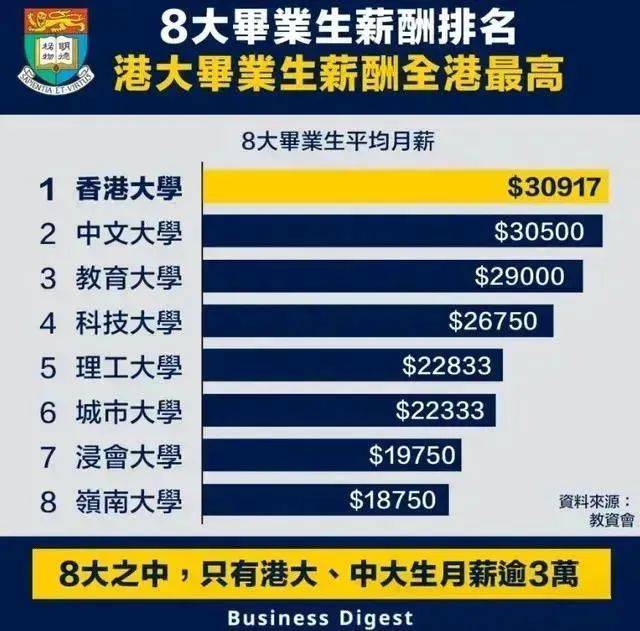 而且,大学教育赞帮委员会还针对1。77万名近两年结业的大学生展开拜候,发布了其他港八大的薪酬环境。如截止到23岁尾,港大的结业生薪酬成为全港最高,平均年薪已达34。7w元,以及港中文、港教大、港科的平均年薪都能达30w元以上。